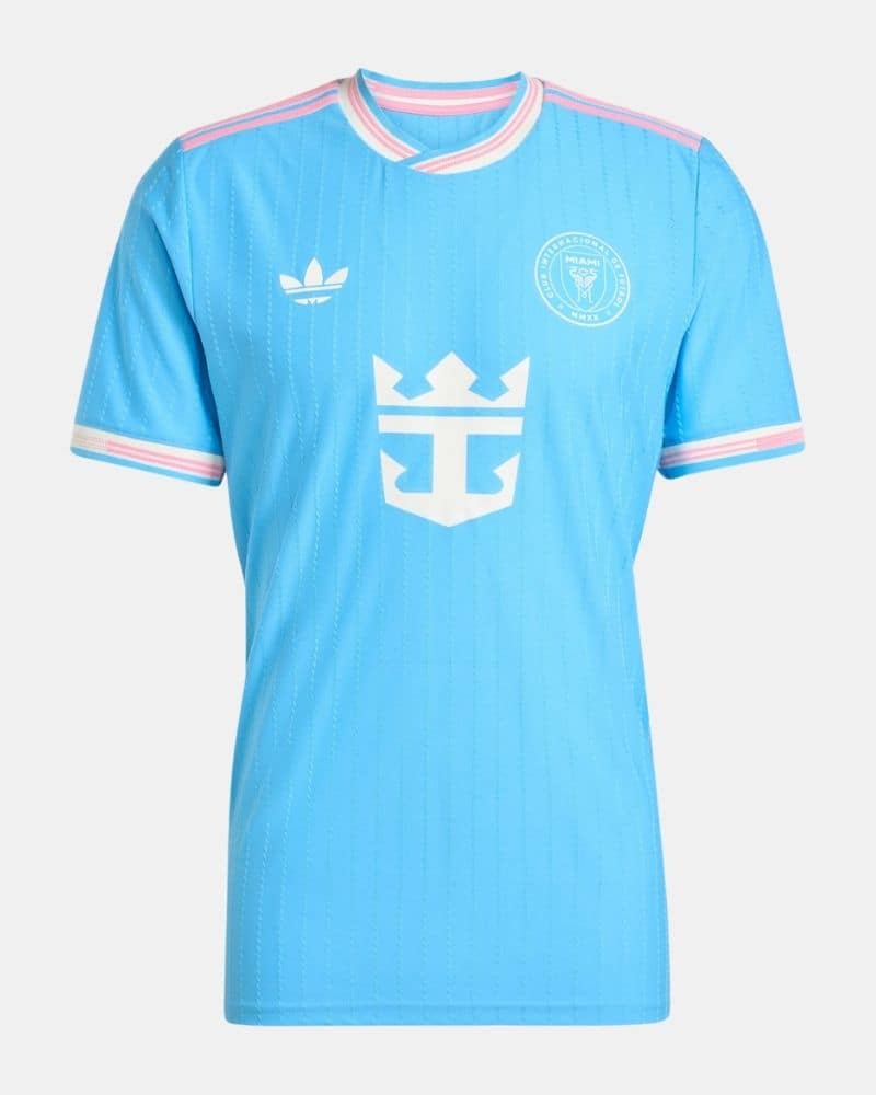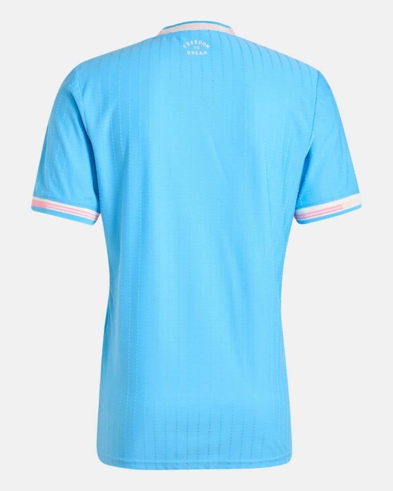 القميص الثالث لإنتر ميامي لموسم 2025 يقدم مزيجاً منعشاً وعصرياً من الألوان، مع الحفاظ على هوية النادي والخط المميز لدوري MLS. القميص لا يحتوي على رسومات طاغية، بل يركز على التباين والانسجام بين الأزرق السماوي والأبيض والوردي.