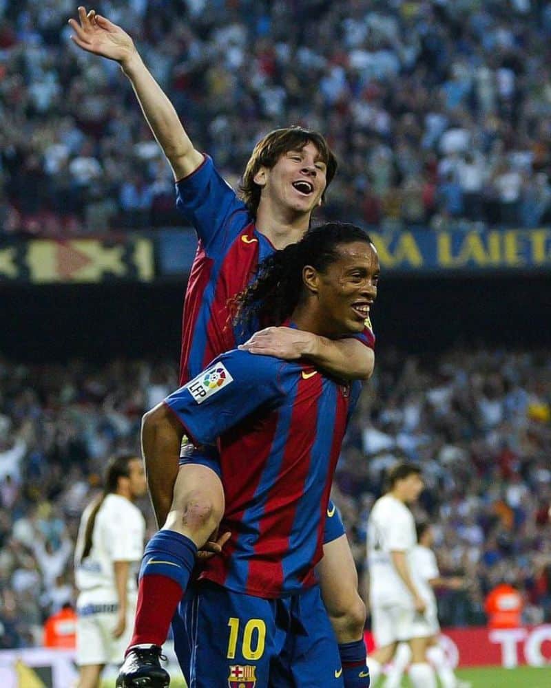 • מסי כובש את שער הבכורה שלו במדי ברצלונה ורץ לחגוג עם רונאלדיניו המבשל