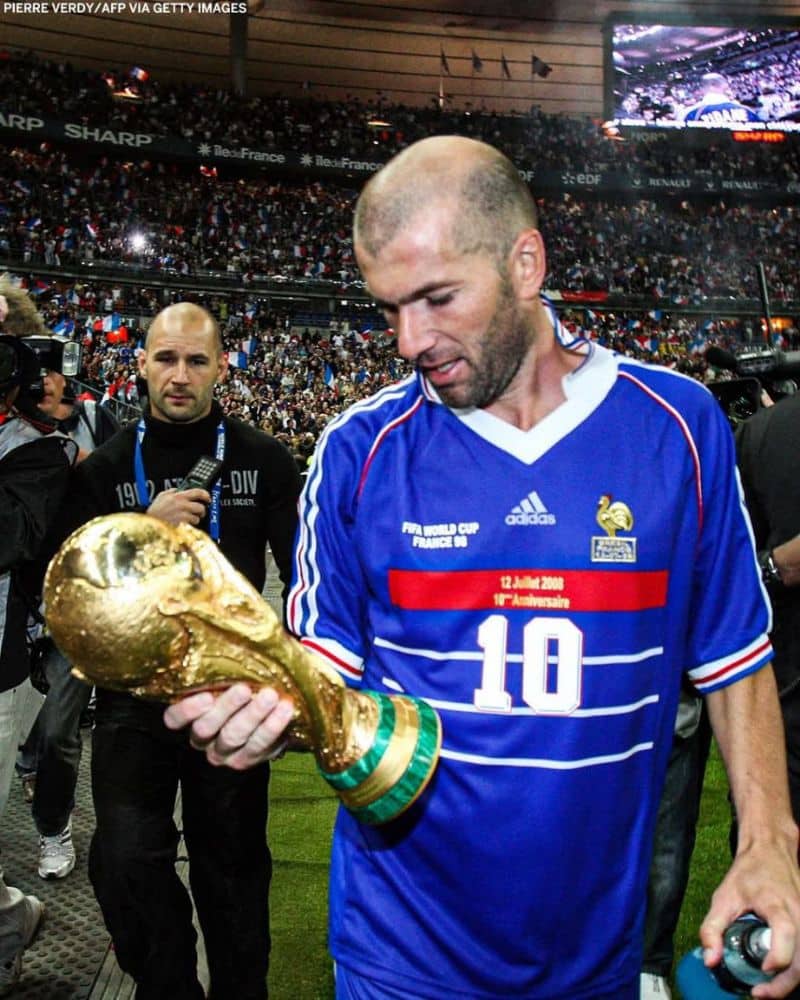 • זידאן מחזיק את גביע העולם לאחר שכבש צמד בגמר נגד ברזיל