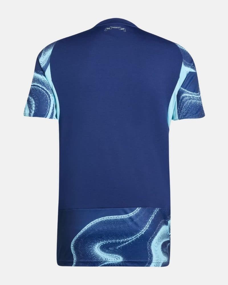 חולצת החוץ של אייאקס לעונת 2025/26 מציגה עיצוב עוצמתי, מודרני ויוצא דופן, תוך שילוב של צבעים נועזים ודפוס גרפי דינמי. בחזית ובשרוולים מופיע דפוס גלי-מרובל (marbled effect) בגוון כחול בהיר יותר, שנראה כמו תנועות של מים או שיש. לדפוס הזה מרקם נקודתי וטקסטורה עמוקה, שמעניקים לחולצה תחושת תנועה ואנרגיה. החולצה הזו מייצגת את הרוח החדשנית של אייאקס – שמרנית במסורת אך אמיצה בעיצוב. שילוב הצבעים הכהים עם הנגיעות הבהירות יוצר ניגוד עוצמתי, והגרפיקה הגלית מוסיפה תחושת תזוזה וחיות שמתאימה למועדון צעיר, התקפי ונועז.