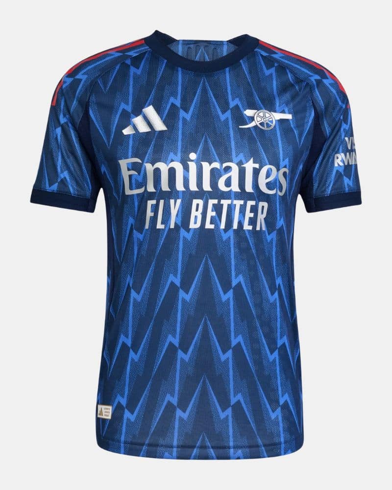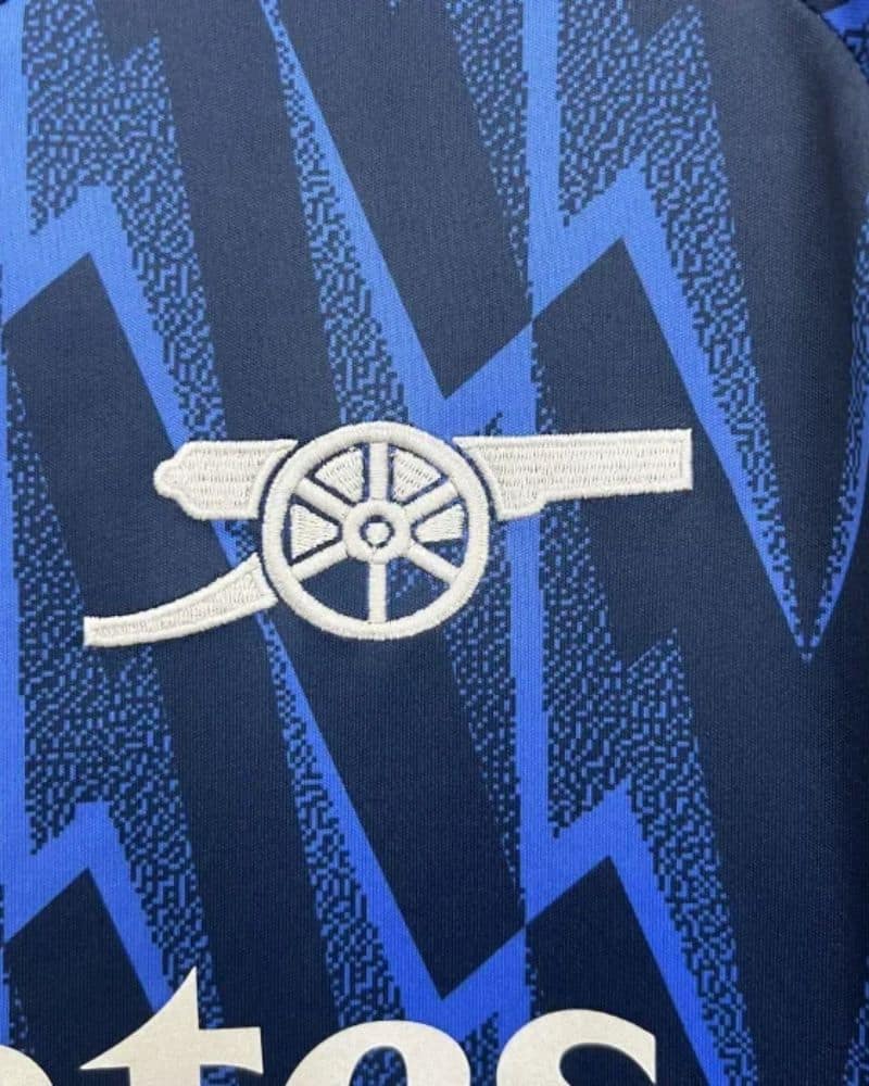 חולצת החוץ של ארסנל לעונת 2025/26 מציגה עיצוב עוצמתי ונוסטלגי, עם מחווה ברורה לאחת מהחולצות האייקוניות של המועדון בשנות ה־90. העיצוב שואב השראה מהחולצה של עונת 1995/96, הידועה בדפוס הברקים הנועז שלה. החולצה החדשה מחייה את המוטיב הקלאסי הזה בגרסה מודרנית ועדכנית.