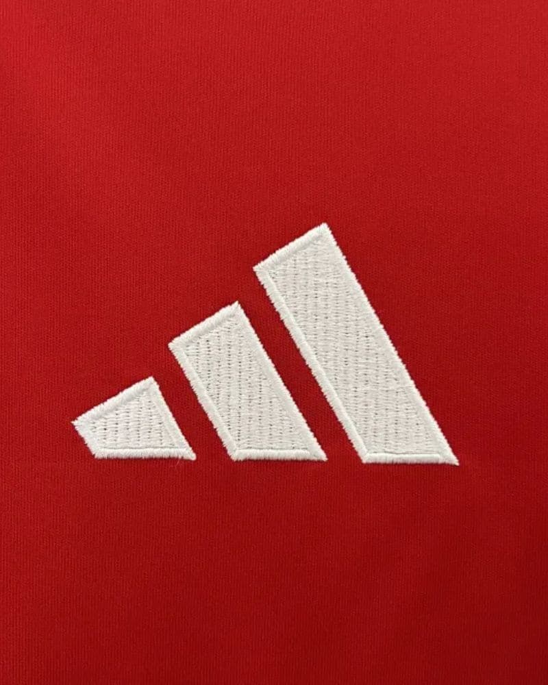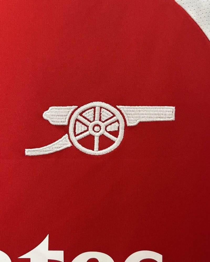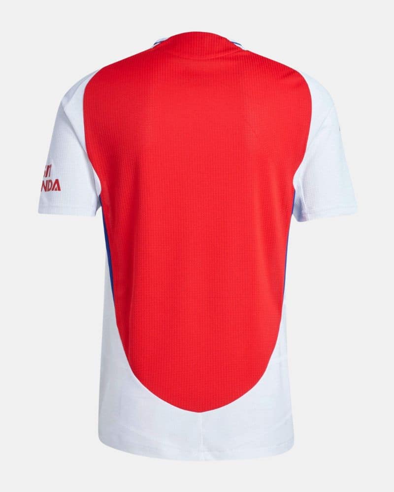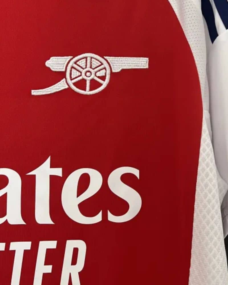 חולצת הבית של ארסנל לעונת 2024/25 משלבת את הצבע האדום הקלאסי של המועדון (Better Scarlet) עם לוגואים בלבן ואלמנטים עיצוביים בכחול כהה.