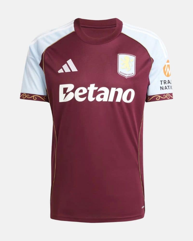 חולצת הבית של אסטון וילה 2025/26 מגיעה בגוון בורדו עיקרי, עם פרטים בכחול ובזהב שמעניקים לה מראה אלגנטי ומרשים.
