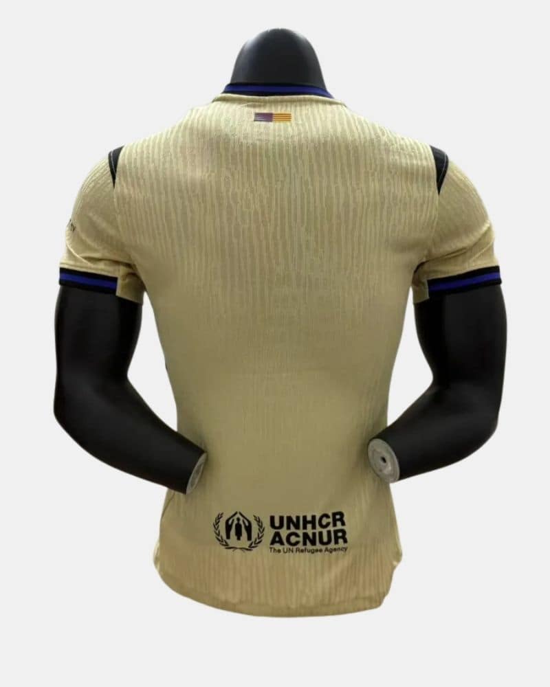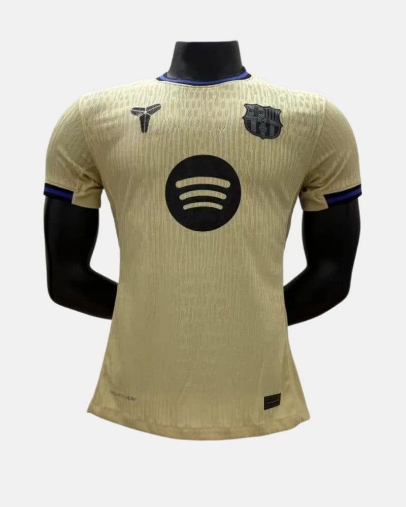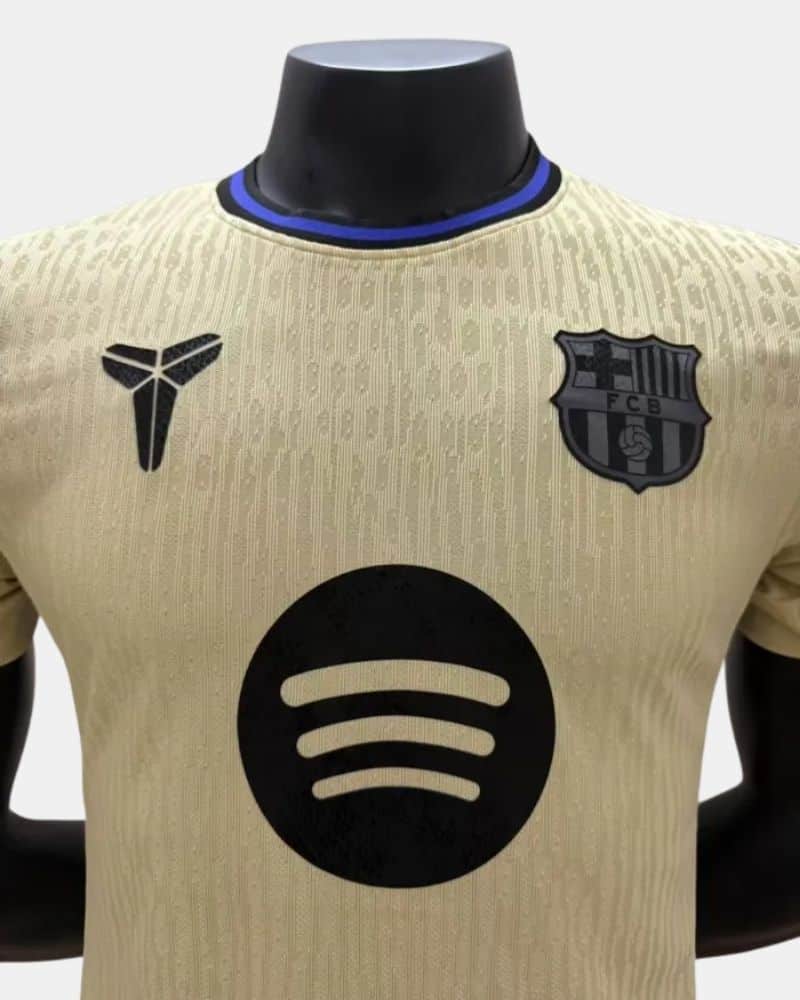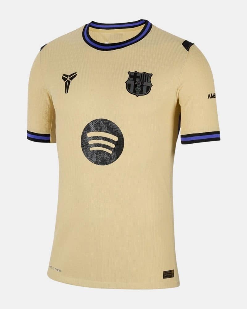 חולצת החוץ של ברצלונה לעונת 2025/26 , מדגם Mamba, מגיעה בגוון עיקרי של זהב-צהבהב בהיר, עם נגיעות עיצוב בצבעים שחור וסגול. שילוב הצבעים מעניק לחולצה מראה ייחודי, דרמטי ומכובד, תוך קריצה לאסתטיקה של קובי בראיינט, שהכינוי שלו "ממבה" (Mamba) נתן השראה לשם הדגם.