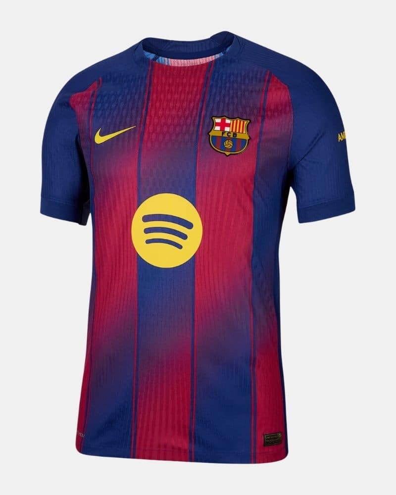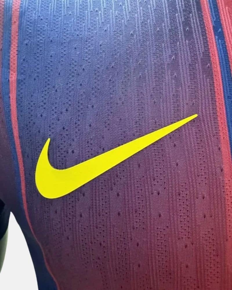 חולצת הבית של ברצלונה לעונת 2025/26 מציגה עיצוב ייחודי עם הפסים האנכיים הקלאסיים בצבעי אדום וכחול כהה. במרכז החולצה יש מעבר הדרגתי בין הפסים אשר יוצר מראה יוצא דופן ומקורי.