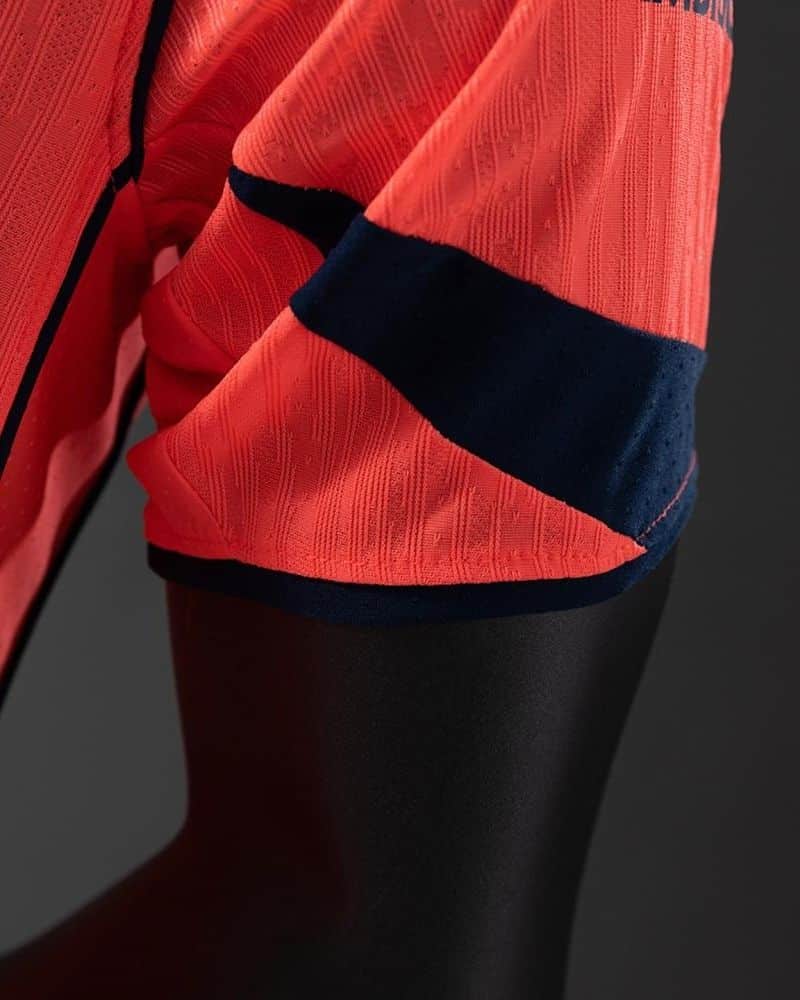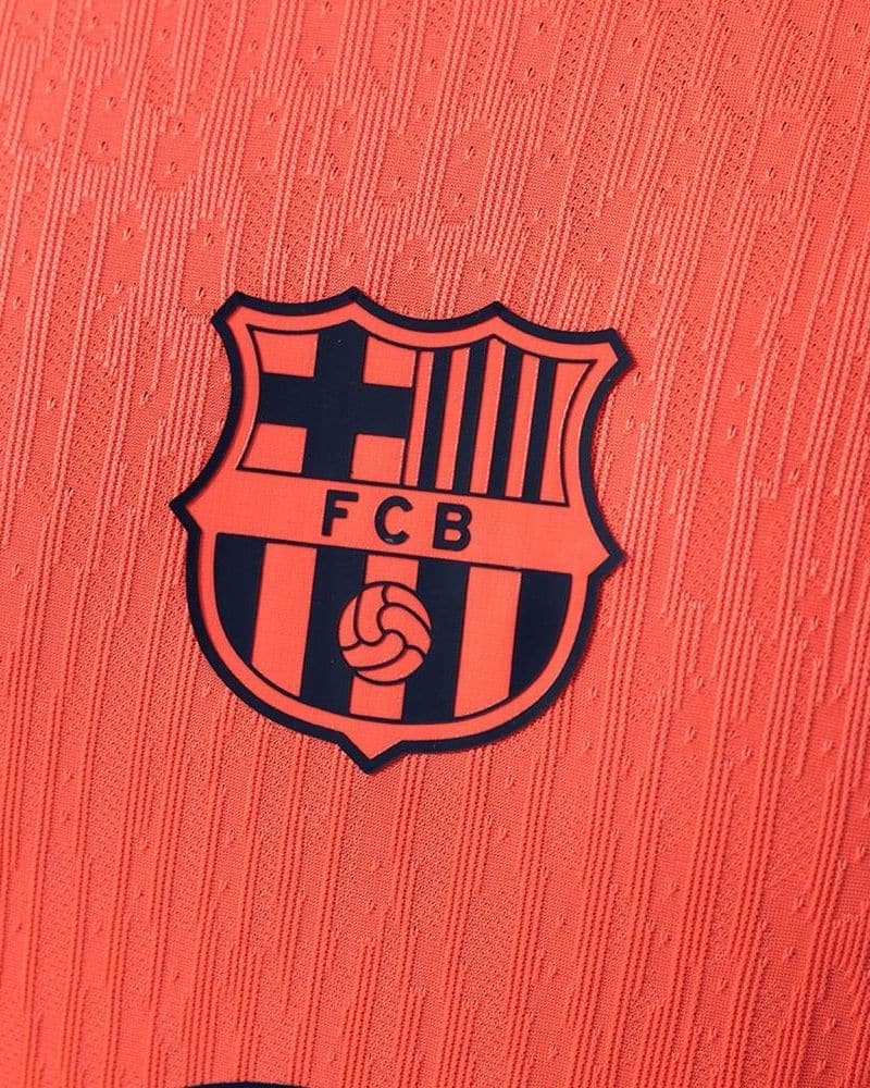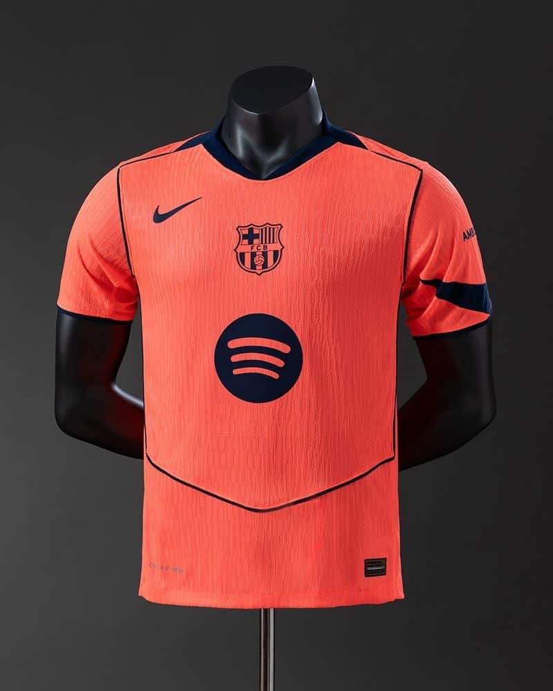 החולצה השלישית של ברצלונה לעונת 2025/26 מגיעה בצבע כתום בוהק ודומיננטי – בצבע הרשמי הנקרא Bright Mango. היא משולבת עם נייבי כהה מאוד (Midnight Navy), שמופיע בפרטים כמו הלוגואים, הצווארון והשרוולים. השילוב בין הכתום האנרגטי לבין הכחול העמוק מעניק לחולצה מראה נועז, צעיר ומודרני, השונה באופן בולט מהקו העיצובי הקלאסי של המועדון – ומושך את העין גם על המגרש וגם מחוצה לו.
