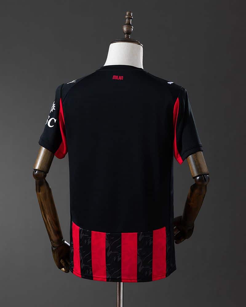 חולצת הבית של מילאן לעונת 2025/26 משלבת בין מסורת לחידוש. היא מציגה פסים אנכיים קלאסיים בצבעי אדום ושחור – הסמל המסחרי של המועדון – עם טוויסט מודרני: טקסטורת שדים מוטבעת בדגם. הפעם, ולראשונה בהיסטוריה של המועדון, הסמל מופיע בגרסה מונוכרומטית בצבע לבן נקי, ללא הצבעים המסורתיים – בחירה נועזת שמבליטה את האלגנטיות של החולצה.