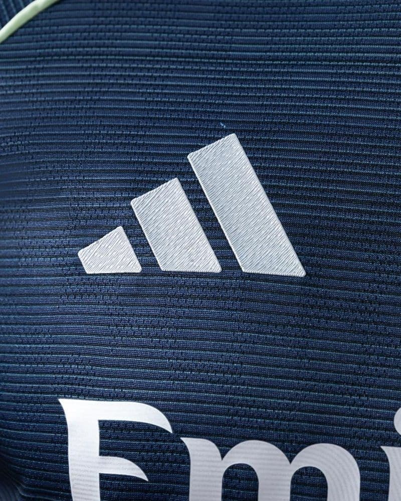 חולצת החוץ של ריאל מדריד לעונת 2025/26 שואבת השראה מהחזית החיצונית של אצטדיון סנטיאגו ברנבאו בלילה. היא מגיעה בצבע כחול נייבי כהה, בשילוב לוגואים בצבע כסף ונגיעות בצבע צהוב בהיר זוהר ("Light Volt"). למרות שמדובר בעיצוב עדין, מופיע על החולצה דפוס קווים המזכיר את המראה הארכיטקטוני של חזית הברנבאו.