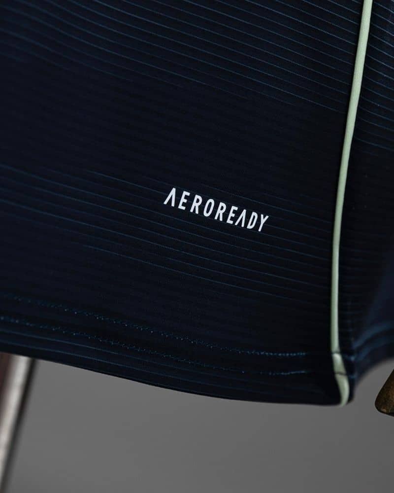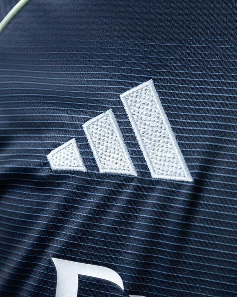 חולצת החוץ של ריאל מדריד לעונת 2025/26 שואבת השראה מהחזית החיצונית של אצטדיון סנטיאגו ברנבאו בלילה. היא מגיעה בצבע כחול נייבי כהה, בשילוב לוגואים בצבע כסף ונגיעות בצבע צהוב בהיר זוהר ("Light Volt"). למרות שמדובר בעיצוב עדין, מופיע על החולצה דפוס קווים המזכיר את המראה הארכיטקטוני של חזית הברנבאו.